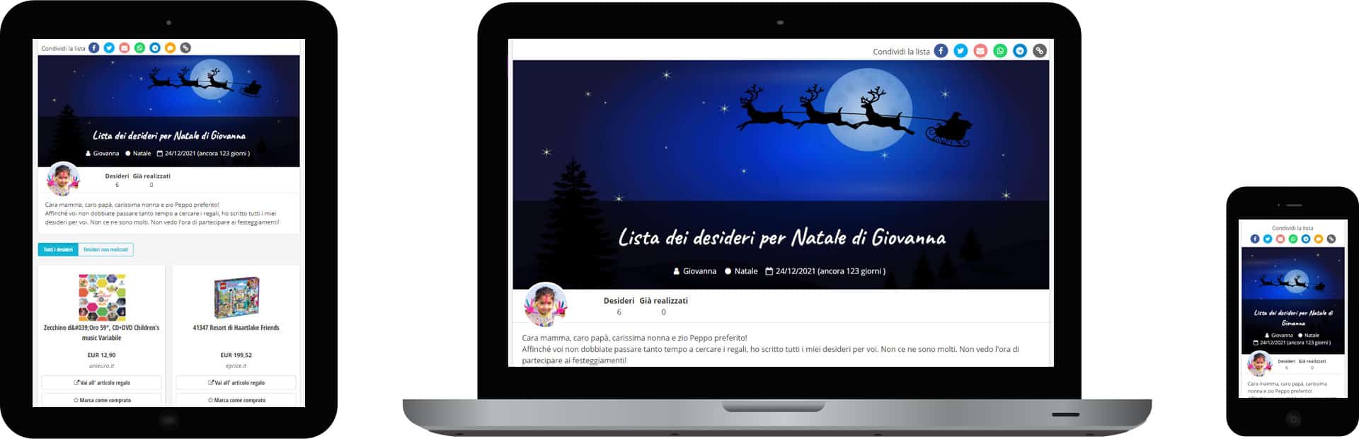 Esempio di una lista per Natale su un tablet, un notebook e uno smartphone